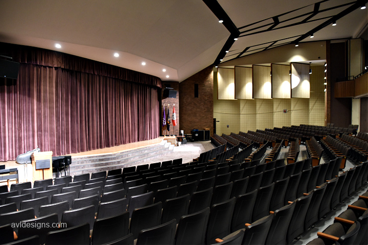 New AV systems included main speakers with over and under balcony delays to fill shadowed areas. A new digital console, wireless microphones, projector and screen, and controls were also included.