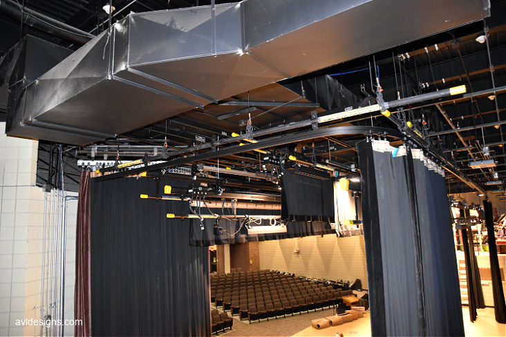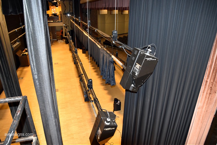 The Lakeshore Middle School auditorium had not been updated in many years. All of the stage rigging is dead-hung due to challenging overhead conditions and lack of stage height. The district wanted to have some moving sets over the stage but the overall rigging was “creatively” installed and not up to safety standards.