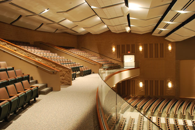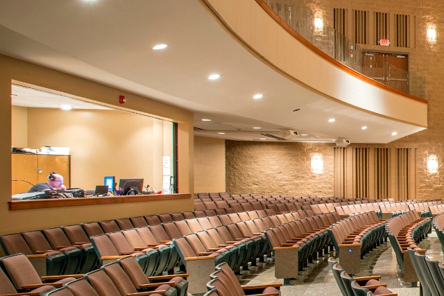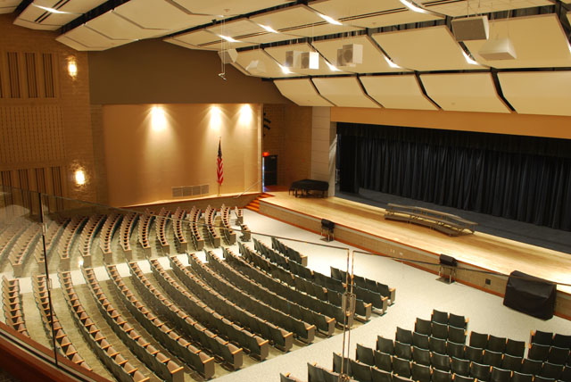 AVL Designs Inc. has been associated with the Vestal School District on past projects which include high school auditoriums and football fields. Working with BCK/IBI we were tasked with designing a new performance space for their new African Road School. This auditorium would be a primary performance space for the district for a variety of events. Acoustic design includes diffusive and reflective elements of many types, including the ceiling which was shaped specifically to provide energy distribution to the balcony in the rear seats. RPG diffuser block would be used extensively on the side walls to provide lateral energy. The sound system design consists of front fill, main seating area, and balcony “over and under” delay systems. Automated and manual controls are both available in the space. For day-to-day use operation is quite simple. For productions, it is run by an operator on a show console. AVL also provided design for all state rigging, theatrical and seating area lighting and audio visual presentation systems.
