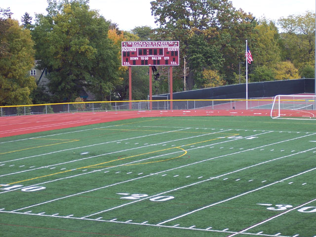 Aquinas high school has a 2000+ seat stadium located in a sensitive residential area. Specific noise requirements needed to be met with the design, as well as performance requirements. • DSP with brick wall limiting was used to provide absolute fixed level announcing and music. • Speaker types and locations were selected to minimize bleed to adjacent areas. • Broadcast wireless was utilized for hearing assistance, feeds to the main building, and food court areas. • Wired broadcast distribution was provided for press hookup. • The system has automated Pink Noise voice coil warming to prevent sudden failure of drivers in extremely cold weather.