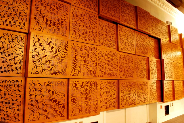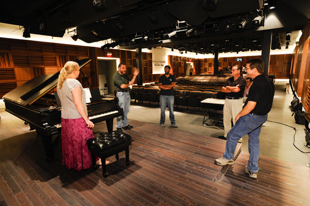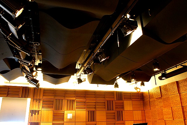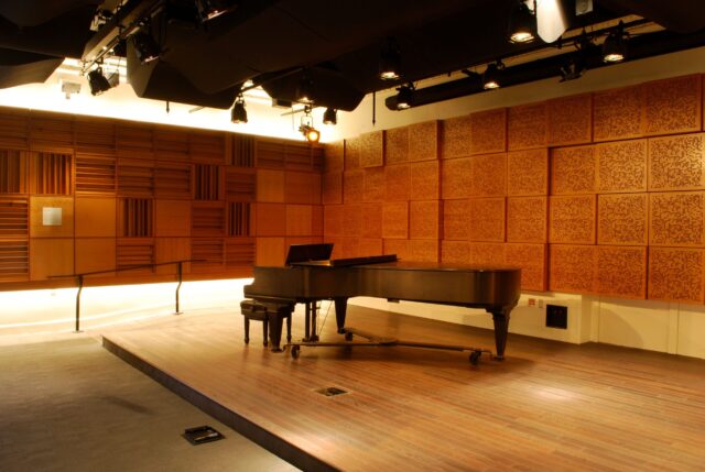 AVL was tasked with providing a recital hall with excellent acoustical qualities within an existing building that posed significant challenges. The space chosen was height limited, and too long for its width and height. The intent was to provide a similar listener experience for all seats, and a sense of warmth and envelopment of sound that is usually found in much larger spaces. The decision was made early in the project to incorporate physical acoustics as well as electronic acoustical enhancement. The physical acoustics were designed as highly diffuse to prevent energy buildup within the narrow confines of the space. A custom designed 3D moveable diffusive absorptive wall at the back of the stage covers the entrance to the green room. The electronic systems are used to add extension to the reverberation time and frequency range that would no be possible physically. The electronic system specified was Yamahas AFC 3. The electronic system also offered an added capability – extensive surround sound capabilities for electronic music. With a matrix of 52 speakers as well as subwoofers, located on the sides and overhead, the system allows panning and movement of sound within the matrix. Dante network control allows access for electronic musical programming across all speakers. The spaces is also used for distance learning masters classes and is equipped with a video conferencing matrix capable of connection many remote sites simultaneously with high speed low latency access. A connected recording Studio allows events in the Ciminelli Hall and the larger performing arts center within Rockwell Hall to be recorded.