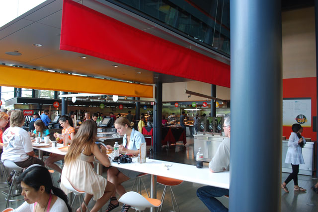 Being a museum of glass, Corning has a lot of glass! When an expansion was undertaken to add a restaurant and store area, the museum decided to take measures to reduce sound level in this busy venue. While there are many glass surfaces, there were also many surfaces that could be treated. Field testing was performed to verify existing conditions. A computer model was implemented to verify the results possible by treating the surfaces that could be treated. The design target was a reverberation reduction of 4 seconds. Wall surfaces, ceiling areas, and other solid surfaces were treated with acoustically absorbent materials that mimic the look of standard materials. Decorative banners were also added to absorb even more sound. While the space is still live (After all, it still has a lot of glass!) the overall reverberation has been reduced significantly.