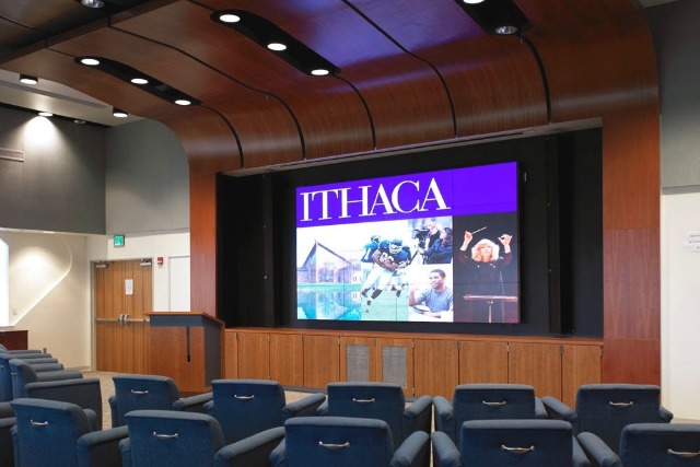 The Ithaca College Gateway Building lecture space is used for a multitude of functions – student orientation, marketing, and lecture. AVL was contracted for acoustical design, video, presentation controls, lighting design/controls, and audio design. A central element is a full HD video wall with the ability to display multiple preset configurations of video sources anywhere on the screen. The control system allows users simple access to all AV and lighting systems in the room in a simple users GUI interface.