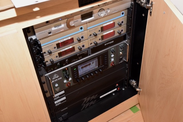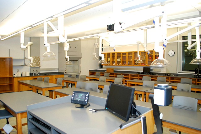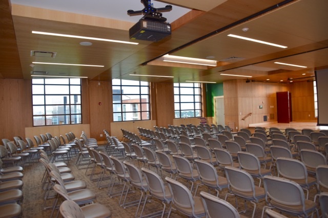 Lemoyne College Grewen Hall. AVL has been working with Le Moyne College for a number of years on many successful projects including classrooms, medical wings, science buildings, performance spaces and other parts of the campus. The most recent project was a renovation of a large lecture hall in Lemoyne’s oldest and largest building: Grewen Hall. AVL Designs Inc.’s role in the renovations was for the acoustical design as well as audio visual design. The wood panels pictured here are an assortment of excellent acoustical products, some absorptive, some reflective, chosen for their unique functions. The AV system features a Crestron control system and Panasonic projectors. All in all, the end users have been very pleased with the results.