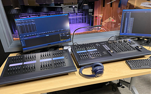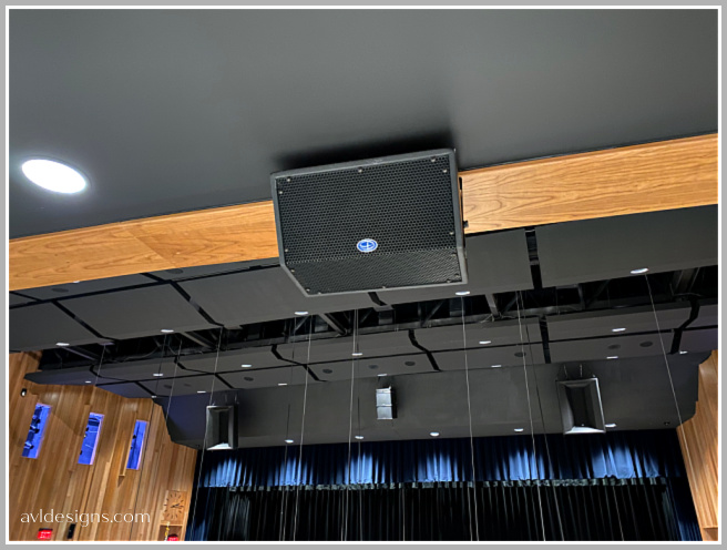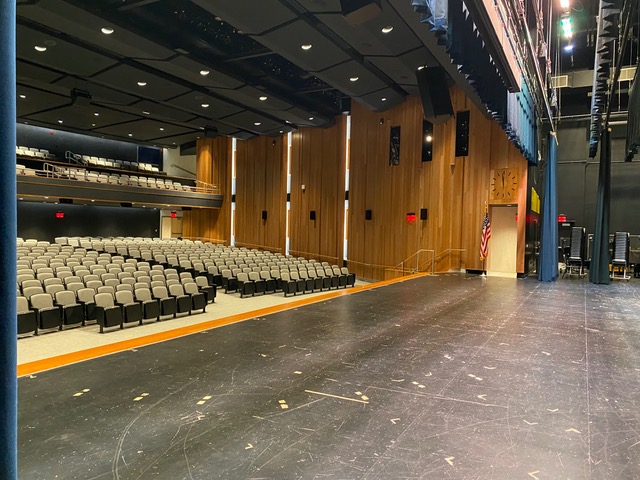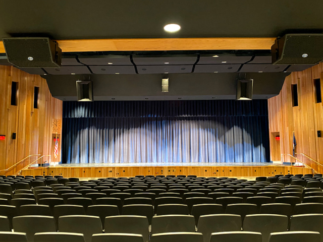 This major renovation meant enlarging the entire auditorium, refurbing the music department and adding some additional rehearsal spaces. Working along with the architects, our plan was to include electronic acoustics in many locations. It would not only be the in the auditorium and on the stage, but also in the large rehearsal rooms for orchestra, band and choral ensembles. Singers and musicians would then be able to rehearse in environments similar to what they would experience in the auditorium. That became the initial driving force for the acoustical design. We had to look at how to treat the main auditorium to get the reverb time low enough and flat enough that when we implement the electronic acoustics, there will not be significant problems with frequency balance and reverberation curves. The electronic acoustics system is based on Yamaha acoustic field correction devices. It is implemented with speakers located onstage, in overhead ceilings, in under-balcony ceilings, and on sidewalls. These systems are providing reverberation as well as early reflection support for the room. The system can also add voice lift to allow for events without sound reinforcement. The auditorium was being dramatically enlarged, shaped with curved walls plus adding a balcony. To deal with that condition we developed a custom absorptive diffusive wall treatment. It consists of series of wells of different depths with perforated materials and solid materials, creating a diffuse sound field within the auditorium and generating a relatively low reverberation time for the size of the room. This design criteria was also used for the music spaces to produce similar reverberation curves for their base conditions. That way, when the electronic systems are commissioned, there will be tunings for each space that will mimic each other to the degree that you can mimic a smaller space to a larger space. In addition to the electronic acoustics and physical acoustic designs for this auditorium, AVL Designs Inc. was contracted for stage rigging, theatrical and house lighting, and sound and video in the space. One of the unusual features of the room is the incorporation of Danley Jericho loudspeakers. The Jerichos look huge and indeed are huge, but they are actually a replacement for line array technology that many auditoriums would implement, at a lower cost and a higher performance level. The Jericho combines a large number of drivers in a single large enclosure, creating an output pattern and sound pressure capability similar to a 12 element tall, mid to large scale line array. Admittedly, it looks a little odd to have boxes this big in a high school auditorium however the pattern control over the wide frequency range of the speaker allows it to cover most of the main floor as well as the balcony without the need for other devices. We also installed over and under-balcony delay fill speakers. This was primarily for potential special effects for theater use, and also to add the few frequencies that would be missing as you go by distance to the back of the room. The audio system is fitted with an Allen and Heath D Live console, which is a substitute for a Yamaha console originally specified. (Due to Covid issues the Yamaha console is not currently available) The D Live is a great console and will do a fantastic job for the school in the new application. Theatrical lighting consists primarily of Electronic Theater Control products and High End systems, with some Strand and Phillips fixtures as well. Stage rigging is a combination of Brick House counterweights and Electronic Theater Controls Prodigy hoists. The Prodigy hoists are used for onstage electrics, as well as a front of house moving head electric. All of the music rooms are used as green rooms, so we have a combination of intercom, call lights, and video feeds to each of those spaces from the main auditorium. The transformation from the original room to what it is now is dramatic.