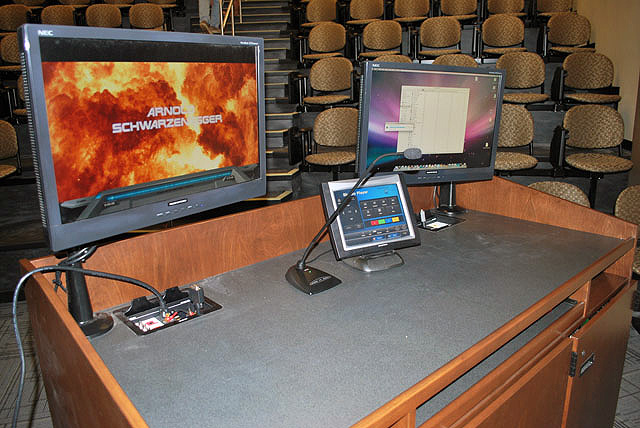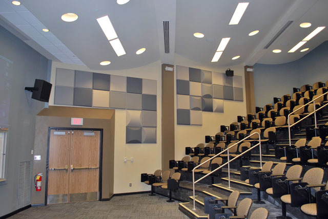 Woodland Hall houses a large lecture hall used for many forms of instruction with the need for extensive AV capabilities. An upgrade was required to accommodate HD video, surround sound, and multi media for a multi faceted faculty using the space. An acoustical upgrade including a new ceiling system, HVAC noise control, and wall treatments were included in the design. Following the upgrades, the room now can be used for lecture by a presenter without a microphone. For those wishing to use microphones, an automated sound system was part of the project. A 7:1 surround system. HD video projection, and touch screen controls that allow presenters or operator access to all system functions.