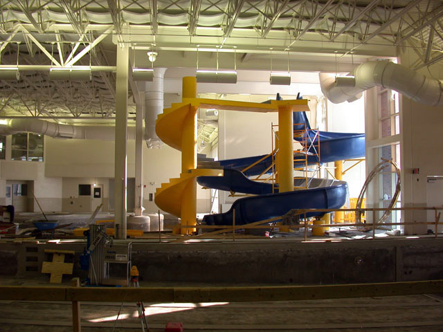 An expansion of the Perinton Community Center was planned to include a large indoor water park and pool. This large building, located at the top of a hill, faces an existing amphitheater that offers music during summer months. The owner was concerned that they not bounce sound off the building into adjacent residential areas, and wanted to prevent echoes back to audience at the amphitheater. Interior acoustics of the water park and pool were additional design concerns. AVL was contracted to provided analysis and recommendations for the building inside and out. Our first recommendation was a shift to the exterior walls and their orientation to eliminate some specific reflections. In design, we also employed a specialty masonry product on large areas adjacent to large vertical glazings. This product (RPG Diffusor Block) effectively breaks up sounds waves instead of reflecting them. This masonry dealt with direct sound hitting the block as well as bounce off the glazing. No neighborhood problems or audience problems occurred after the structure was finished and the summer concert season ran without incident. We had been brought into the project later in the design process so roof decks within the spaces were solid not acoustical. Interior acoustics were controlled with absorbent lapendary baffles applied up at the roof deck, making the solution relatively invisible to patrons. The interior acoustics are appropriate for a natatorium and the community is making wide spread use of the facility.