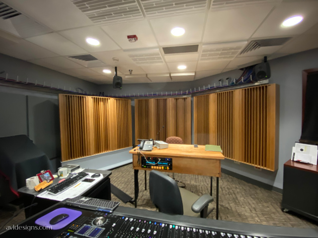 WXXI TV reached out to AVL Designs Inc. to design the interior acoustics and assist with noise control in their product 225 control room. They had recently purchased an AVID S4 Yukon console for the suite and wanted a control room that provided a better mix environment. The space is an unusual shape with some features that cannot be changed. The oddly trapezoid room with one glass door to the side of the mix position, and a large window to the live room that could not be relocated, was limited in height. It also had an electrical panel that could not be covered for code reasons. The first order of business was HVAC noise control. The background in the space was NC 40+. Ductwork design was what you see in office spaces, not studios. Working with their mechanical contractor we determined to enlarge ducts, change diffusors, move VAV’s, and control velocities. The result ticks in at NC20. The new space was to have a mix position and a client listening position in the rear of the space, where it narrows considerably in a “V”. To even out response, we determined to use high order quadratic diffusors on the back wall. An electrical panel presented a problem. It could not move and had to be accessible. Some of the broadband quadratic diffusors were designed into a custom designed rolling cart. This allows them to go over the electrical panel but be legal as they could be moved. This allowed matching the rear sides of the space with broadband diffusion. GUD high frequency diffusors on side walls and the ceiling over the mix position to enlarge the mix image area back to the client desk. The sound at the client desk is just as linear and only down in level by 3dB from the main mix position. All products were from Real Acoustix. Due to the door location and the “V” in the rear of the room, typical placements for bass traps were negated. We decided to use bass traps within the celling system, a bit unusual but it worked. Overall response is very linear, and only two subtle filters were used to final tune the Rogers LS3 main speakers.