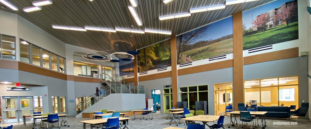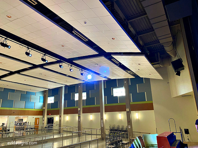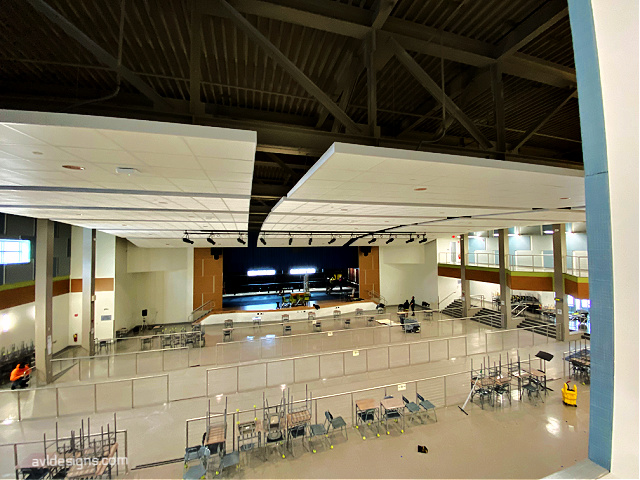 Back to the “cafetorium” tag. The middle school uses this facility as a lunchroom, a teaching/study area and, now, an auditorium. Anyone remember what the sound was like in your old school cafeteria? Well, nothing has changed! Cafeteria sound, untreated, is like living in a tin-can.