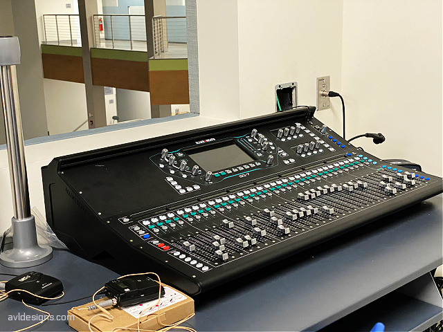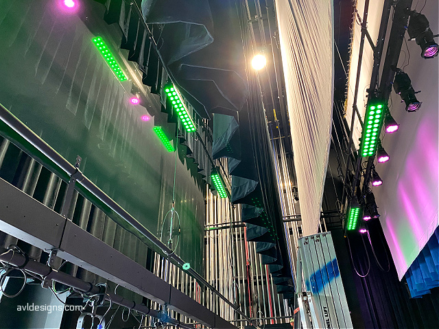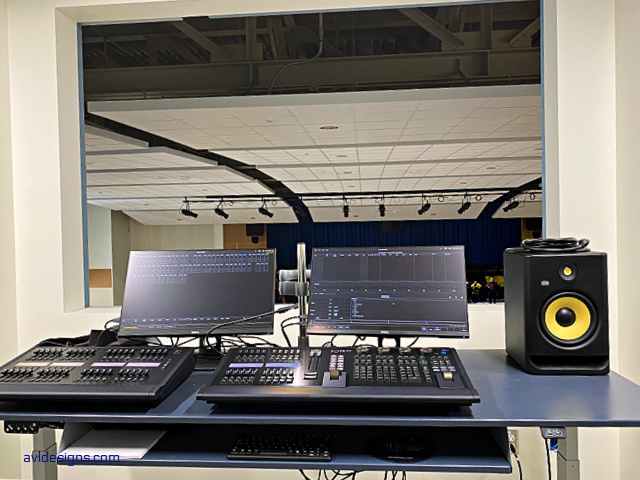 The control room was elevated to make way for cafeteria use. This change then made it necessary to enable remote monitoring so that the audio operator can hear what is going on in the room below. Pro lighting consists of color changing LEDs in various locations in the room, which you can see in the pictures.